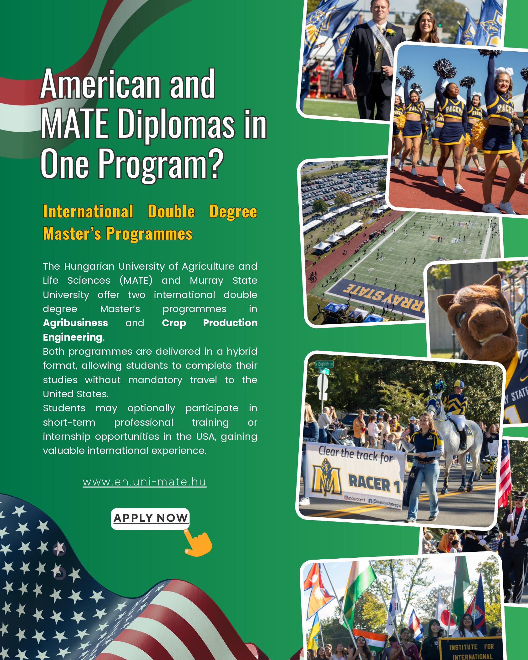 Based on the cooperation agreement between the Hungarian University of Agriculture and Life Sciences (MATE) and Murray State University (MSU), the programs can be completed as double degree programs. The duration of the studies is 4 semesters, with courses offered in parallel in the curriculum by both MATE and MSU.
